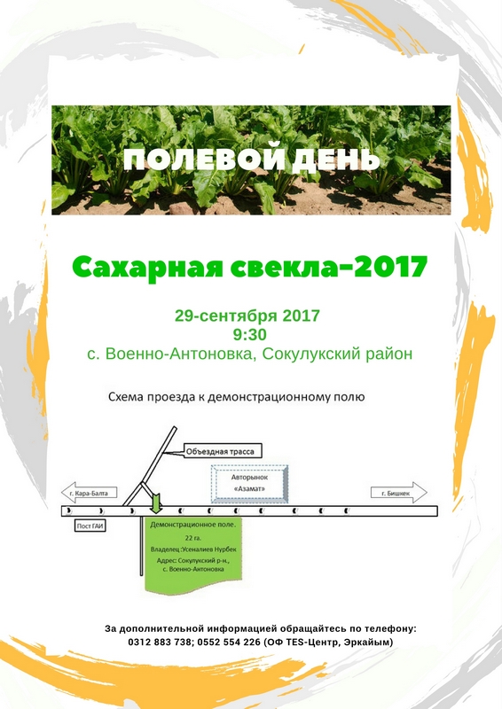Сахарная промышленность является одним из приоритетных направлений социально-экономического развития Кыргызской Республики. С целью создания условий для эффективного и прибыльного развития свеклосахарной отрасли и сахарного бизнеса, компания «KWS» (селекционная компания по производству семян) совместно с ОАО «Каинды-Кант» проводят широкомасштабный полевой день на тему «Сахарная Свекла – 2017». На полевом дне будут продемонстрированы современные гибриды сахарной свеклы, средств защиты растений, современная сельхозтехника и сопутствующие финансовые услуги.